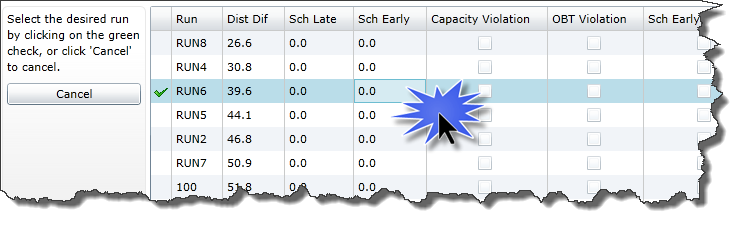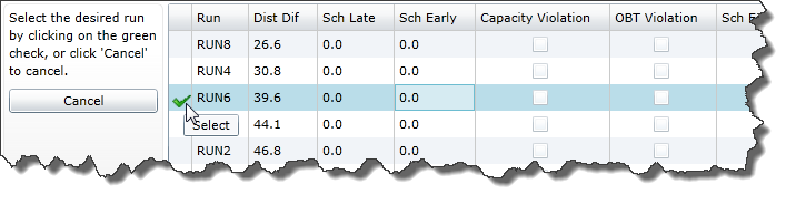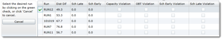 icon will show a list of possible runs to place the trip on within the parameters of the Single Insert Violation defined within the Violation Sets tab (See Data screen documentation for more information).