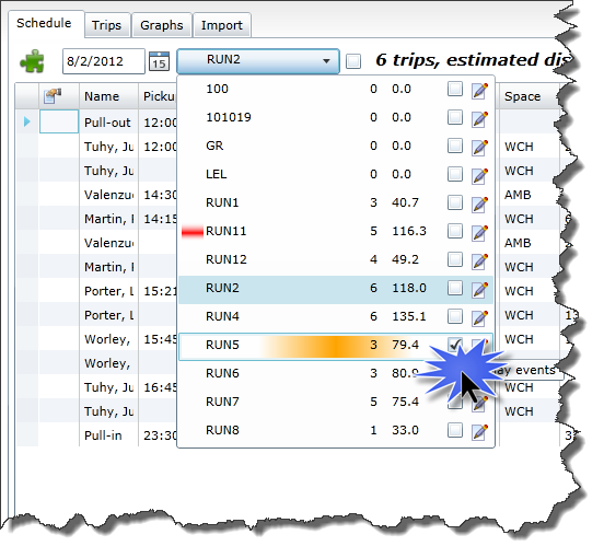 Check-boxes to the right of the run indicate which violations the trip would be making if placed on that run.